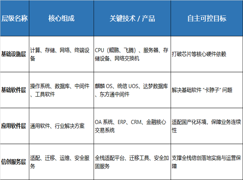 目前最高要求是全栈信创(又称全量信创/全链路信创),通常指在信息技术应用创新(信创)背景下,从底层硬件(如CPU、主控芯片)、基础软件(操作系统、数据库、中间件)、到上层应用软件和安全体系,全部采用国产自主可控的技术和产品。以此形成端到端的完整技术栈,是信息技术生态体系的重构。